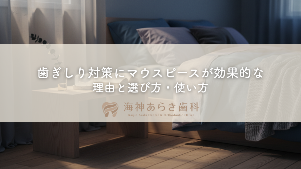 海神あらき歯科・矯正歯科では噛み合わせや歯ぎしりの相談に対応しています。初診では症状を確認し、マウスピースの必要性や使い方の目安をご説明しています。