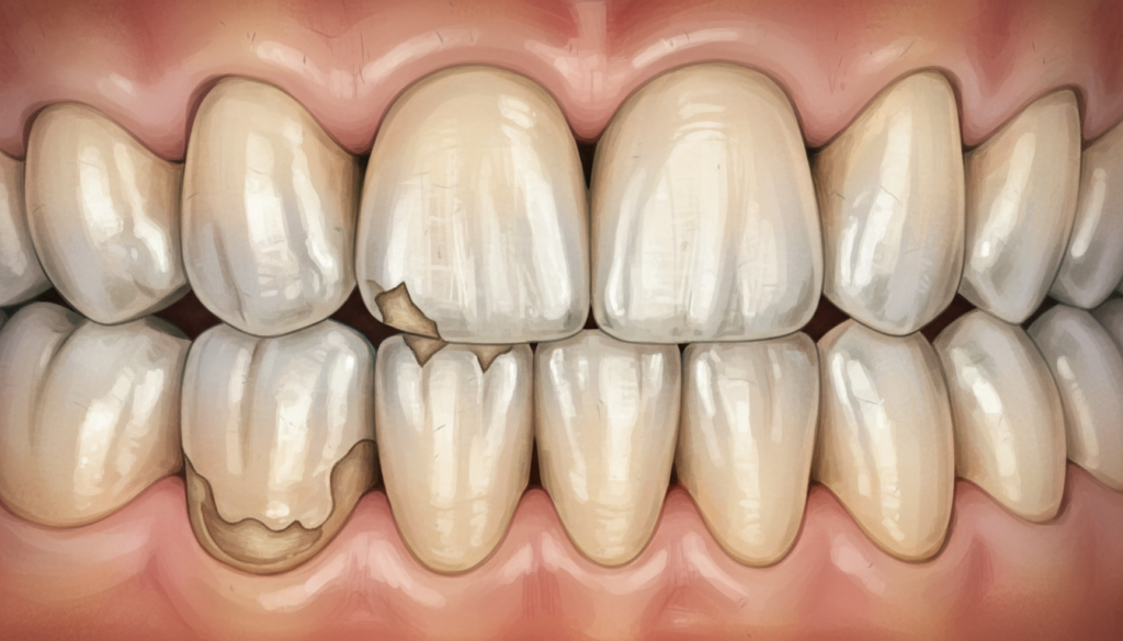 この強い力が長期間続くと、歯の表面が摩耗して短くなったり、歯にヒビが入ったり、最悪の場合は歯根が割れて抜歯が必要になるケースもあります。また、セラミックなどの被せ物が割れたり、詰め物が外れたりする原因にもなります。