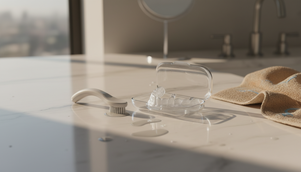 マウスピースは毎日清潔に保つことが大切です。使用後は水またはぬるま湯で洗い流し、歯ブラシで優しく磨いてください。